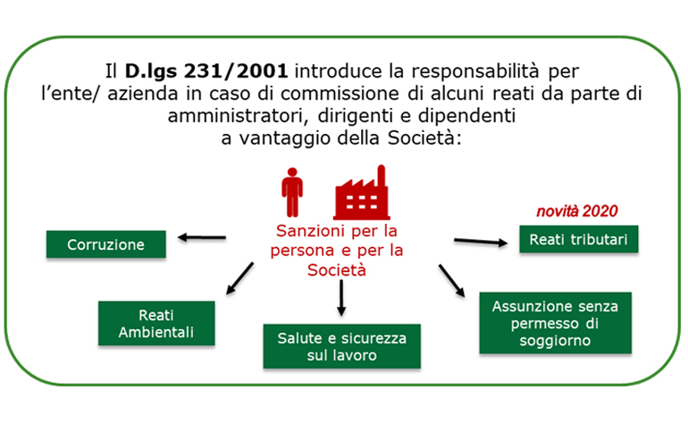 E’ la normativa che disciplina la responsabilità degli enti e delle imprese in relazione a reati commessi o tentati nell’interesse o a vantaggio delle società per gli illeciti commessi da soggetti apicali e/o dipendenti.